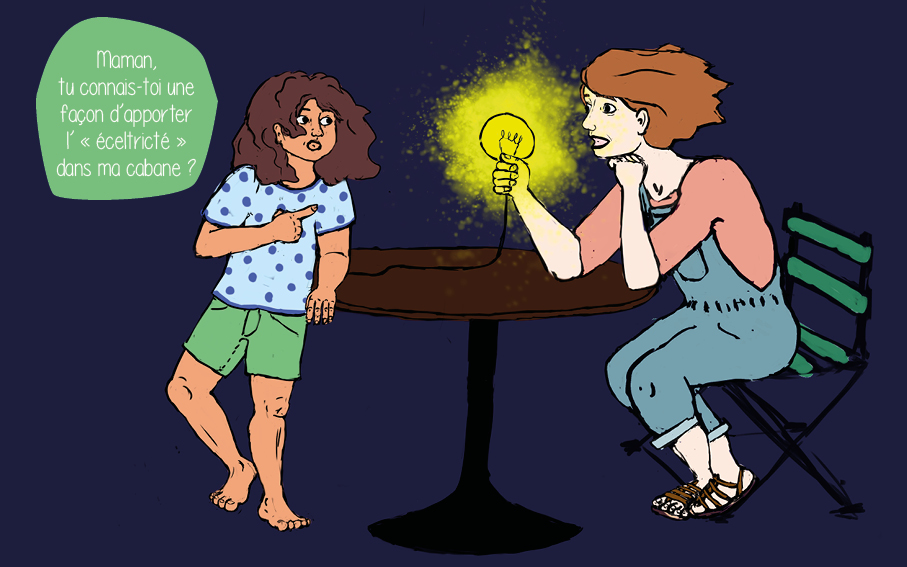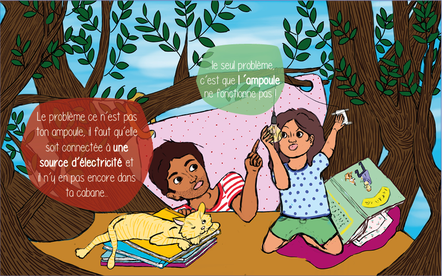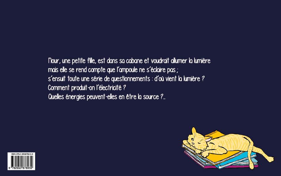 Nour, une petite fille, est dans sa cabane et voudrait allumer la lumière mais elle se rend compte que l’ampoule ne s’éclaire pas ; s’ensuit toute une série de questionnements : d’où vient la lumière ? Comment produit-on l’électricité ? Quelles énergies peuvent-elles en être la source ?